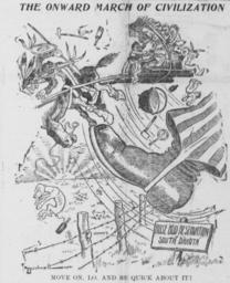 Keywords: Bushnell cartoon about evicting the Sioux from South Dakota.jpg Theodore Roosevelt President Roosevelt making the lands of the Rosebud Indian Reservation available for purchase by settlers for three dollars an acre E A Bushnell depicted a Sioux family being physically kicked into the air by the giant foot of Uncle Sam identifiable by the striped pant-leg and starred boot The title is THE ONWARD MARCH OF CIVILIZATION and the caption says MOVE ON LO AND BE QUICK ABOUT IT 1904-05-13 http //chroniclingamerica loc gov/lccn/sn88085187/1904-05-13/ed-1/seq-1/ The Tacoma Times Creator E A Bushnell other versions PD-old-70-1923 Images from The Tacoma Times Cartoons by E A Bushnell |