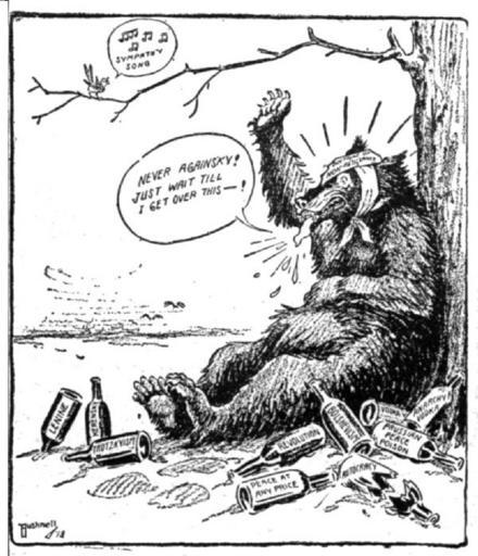 | Keywords: Bushnell cartoon of Russia regretting its participation in WW1 (May 1918).jpg Russian bear sits under a tree hung over and with its injuries bandaged as it vows to never againsky do something so foolish and then swears that it will get revenge as soon as it has recovered The empty bottles scattered around it are labeled Lenine Trotskyism Kerensky Autocracy Revolution Peace at Any Price Bolshevism Prussian Peace Poison Vodka and Anarchy Vodka The bandage on the bear's head is labeled non-belligerence 1918-05 Current History A Monthly Magazine of the New York Times May 1918 - Vol VIII Part I No 2 http //www gutenberg org/files/38750/38750-h/38750-h htm Creator E A Bushnell PD-old-auto-1923 1937 Uploaded with UploadWizard Cartoons by E A Bushnell 1910s political cartoons of the United States ImageNote 1 106 473 33 79 600 698 2 Kerensky ImageNoteEnd 1 ImageNote 2 466 501 44 27 600 698 2 VODKA ImageNoteEnd 2 ImageNote 3 132 59 108 33 600 698 2 SYMPATHY SONG ImageNoteEnd 3 |