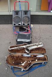 Keywords: BuskingEquipment.JPG en The equipment of a professional busker that I was minding while he went to the toilet It seems to consist of from top to bottom trolley speakers amplifier and music player power source instrument saxophone and instrument case own Simon Speed 2013-02-02 Busking Photos by Simon Speed Taken with Nikon Coolpix S520 Tenor saxophones Cc-zero |