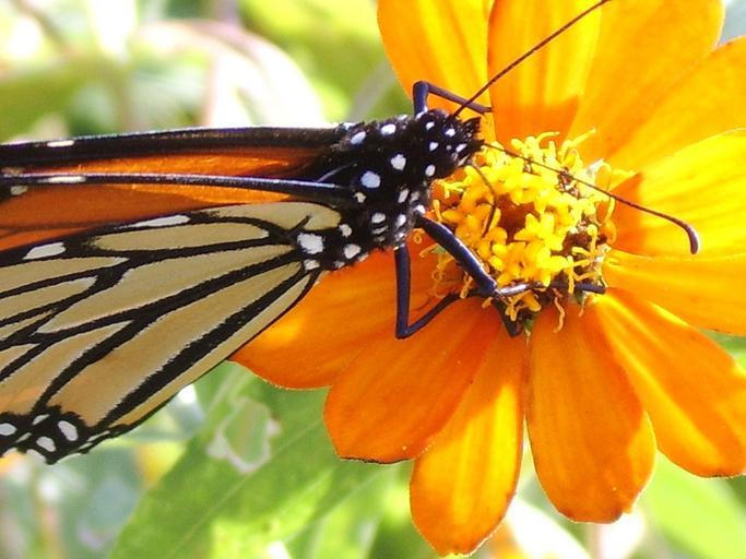 Keywords: butterfly monarch insect flower orange cosmos antennae antenna fauna