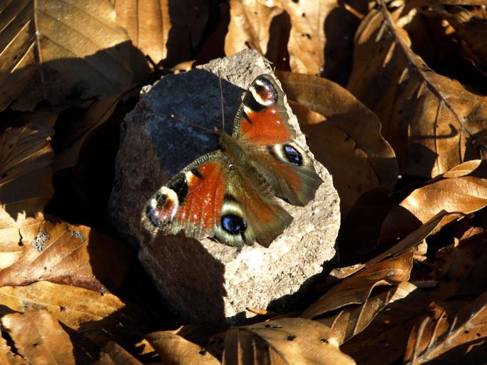 Keywords: butterfly peacock butterfly autumn insect stone shadow leaves sun warm