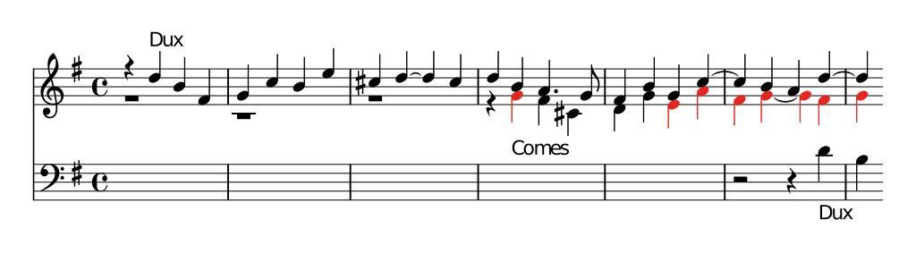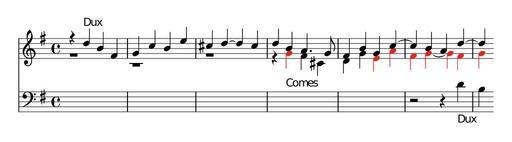 Keywords: BuxWV147-Dux-Comes.svg de Dux und Comes von Fuge BuxWV 147 nach File BuxWV147-Dux-Comes GIF Erstellt mit LilyPond Dux and Comes or leader and follower in BuxWV 147 after File BuxWV147-Dux-Comes GIF Made with LilyPond Source Code <pre> \version 2 12 3 << Violinschlüssel Stimme 1 \clef violin \key g \major \time 4/4 r4 d Dux b' fis' g' c b' e cis d~ d cis d b' a'4 g'8 fis'4 b' g' c~ c b' a' d~ d \\ Violinschlüssel Stimme 2 \clef treble \key g \major \time 4/4 r1 r r r4 \once \override NoteHead 'color red \once \override Stem 'color red g'_ Comes fis' cis' d' g' \override NoteHead 'color red \override Stem 'color red e' a' fis' g'~ g' fis' g' Bassschlüssel \new Staff \clef bass \key g \major \time 4/4 s1 s s s s r2 r4 d'_ Dux b >> </pre> 2012-05-07 own Christian Stroppel SVG Brian Ammon File BuxWV147-Dux-Comes GIF cc-zero Sheet music of Dieterich Buxtehude Fugues |