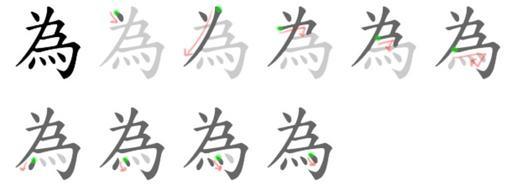 Keywords: 為-bw.png 為 WÉI v Do act; act as; become; be mean Stroke count 9 Alternate traditional form Kai Shu style 2005-09-03 own assumed Kamlung~commonswiki Chinese kanji stroke order