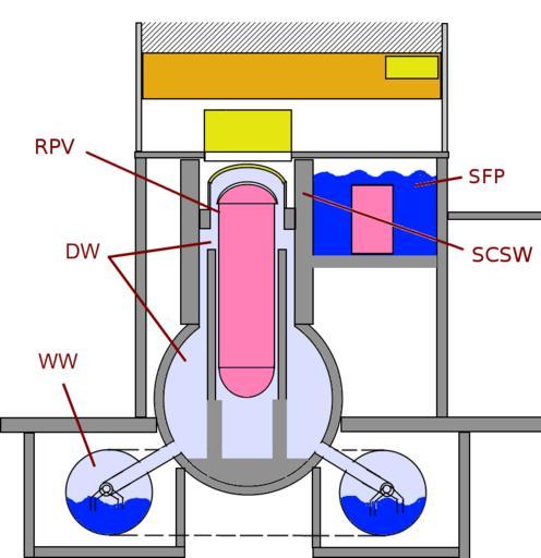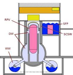 Keywords: BWR Mark I Containment sketch with downcomers.png en Rough sketch of a typical Boiling water reactor BWR Mark I Concrete Containment with Steel Torus including downcomers as used in the BWR/1 BWR/2 BWR/3 and some BWR/4 model reactors DW Drywell WW Wetwell SFP Spent Fuel Pool RPV Reactor Pressure Vessel SCSW Secondary Concrete Shield Wall fr Diagramme/coupe d'un réacteur à eau bouillante REB typique de type Mark I à enceinte de confinement en béton avec tore d'acier sous-jacent tel qu'utilisé dans les réacteurs de type REB/1 REB/2 REB/3 et certains REB/4 es Diagrama/corte esquemático de un reactor de agua en ebullición tipico del tipo Mark I con recinto de contención en hormigón con toro subyacente en acero como los utilizados en los reactores de tipo BWR/1 BWR/2 BWR/3 y algunos BWR/4 ca Esquema d'un reactor d'aigua en ebullició BWR Boiling water reactor de tipus Mark I amb contenció de formigó i torus d'acer incloent baixants com els utilitzats en els models de reactor BWR/1 BWR/2 BWR/3 i alguns BWR/4 DW Pou sec WW Pou moll SFP Piscina del combustible gastat RPV Vas a pressió del reactor SCSW Paret secundària amb blindatge de formigó Sketched in Paint net using 826 x 852 canvas inspired by Page 15 pdf 40 Containment Integrity Research at Sandia National Laboratories - An Overview Manuscript completed March 2006 Published July 2006 id NUREG/CR-6906 and SAND2006-2274P http //www nrc gov/reading-rm/doc-collections/nuregs/contract/cr6906/cr6906 pdf - Prepared by Sandia National Laboratories for the U S Nuclear Regulatory Commission Job Code Y6757 The two diagrams on the same page are labeled Figure 5 Typical BWR Mark I Concrete Containment with Steel Torus User 84user 2011-03-16 <gallery> File BWR Mark I Containment sketch with downcomers svg SVG version File BWR Mark I Containment diagram png original diagram from page 15 of the source File BWR Mark I Containment sketch png sketch without downcomers File BWR Mark I Containment sketch primary png primary containment outlined in purple File Reaktor svg detalied SVG version </gallery> ImageNote 2 329 273 96 321 826 852 2 reactor pressure vessel ImageNoteEnd 2 ImageNote 3 314 382 16 231 826 852 2 Cylindrical biological shield ImageNoteEnd 3 ImageNote 4 332 277 92 34 826 852 2 Top head assembly ImageNoteEnd 4 ImageNote 7 311 167 135 80 826 852 2 Drywell head and refueling assembly ImageNoteEnd 7 ImageNote 8 233 240 293 518 826 852 2 Inverted lightbulb drywell containment chamber ImageNoteEnd 8 ImageNote 9 208 34 474 199 826 852 2 Upper part of building housing crane and refueling assembly ImageNoteEnd 9 ImageNote 10 92 683 567 138 826 852 2 Wetwell torus holding the suppression pool of water to handle excess steam vented from the reactor above ImageNoteEnd 10 ImageNote 11 483 245 181 144 826 852 2 Spent fuel pool area highly simplified here ImageNoteEnd 11 ImageNote 12 216 78 458 74 826 852 2 Gantry crane ImageNoteEnd 12 ImageNote 13 554 740 69 57 826 852 2 Downcomer tubes duct the steam below the water surface so that it condenses thereby reducing the pressure ImageNoteEnd 13 BWR Mark I Containment sketch with downcomers svg Schemata of boiling water reactor |