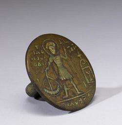 | Keywords: Byzantine - Pilgrim Stamp of Saint Isidore - Walters 54230 - Three Quarter.jpg St Isidore was martyred on the Greek island of Chios in AD 251 The well into which his body was thrown later became a healing shrine represented at the right The ship to the left refers to Isidore's role as patron saint of sailors as well as to the ships that carried pilgrims to his island shrine This stamp used to produce pilgrim tokens has a backward inscription that becomes legible when imprinted in clay century 6 Late Antique bronze cm 5 9 6 3 8 accession number 54 230 22682 Dikran Kelekian Constantinople and Paris date of acquisition unknown by purchase Henry Walters city Baltimore Walters Art Museum Henry Walters Acquired by Henry Walters 1912 Translation inscribed in reverse + Saint Isidore / Jesus Christ / Receive a blessing Early Christian and Byzantine Art Baltimore Museum of Art Baltimore 1947 Sacred Souvenirs Byzantine Pilgrimage Art Dumbarton Oaks Washington 1982 Treasures of Heaven The Cleveland Museum of Art Cleveland; The Walters Art Museum Baltimore; The British Museum London 2010-2011 place of origin Chios Greece Walters Art Museum license Byzantine and Early Russian art in the Walters Art Museum Decorative and applied arts of Byzantine Empire Pilgrim stamp seals and clay tokens Archaeological seals device Stamp seals of archaeology Ships on seals |