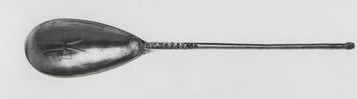 | Keywords: Byzantine - Spoon - Walters 57651 - Top.jpg In the Christian East priests and lay people have always taken Communion with both bread and wine in the medieval West wine was reserved for the clergy The bread is soaked in the wine and presented to the worshipers with spoons like this one Its inscription For the prayer of Heliodorus shows that such gifts to a church were seen as permanent material prayers for one's salvation The church at Kaper Koraon a relatively small settlement in Byzantine Syria owned numerous silver vessels of which 56 survive A holy oil bottle and a chalice were also donated by the same Heliodorus ca 565 Late Antique silver traces of niello cm 2 5 18 h x l ; bow cm 3 7 w accession number 57 651 36298 Excavated in Syria 1908-1910 Tawfic Abucasem Hama and Port Said ca 1913 by purchase Joseph Brummer Paris ca 1928 by purchase Henry Walters city Baltimore Walters Art Museum Henry Walters Acquired by Henry Walters 1929 Translation + In fulfillment of a vow of HELIODOROS Early Christian and Byzantine Art Baltimore Museum of Art Baltimore 1947 Illuminated Manuscripts Masterpieces in Miniature The Walters Art Gallery Baltimore 1984-1985 Silver Treasure from Early Byzantium The Walters Art Gallery Baltimore 1986 Realms of Faith Medieval and Byzantine Art from the Walters Art Museum Frist Center for the Visual Arts Nashville 2001-2002 Realms of Faith Medieval and Byzantine Art from the Walters Art Museum Frist Center for the Visual Arts Nashville 2002-2005 Realms of Faith Medieval and Byzantine Art from the Walters Art Museum Museum of Biblical Art New York; Colby College Museum of Art Waterville; Joslyn Art Museum Omaha 2008-2009 place of origin England United Kingdom Walters Art Museum license Byzantine silver in the Walters Art Museum Decorative and applied arts of Byzantine Empire Divine Liturgy spoons Media contributed by the Walters Art Museum needs category review |