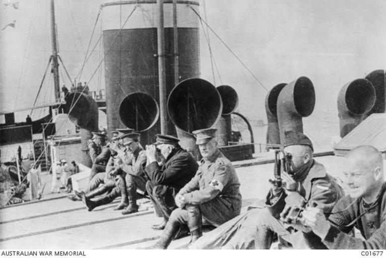 | Keywords: C01677.JPG author 25 April 1915 Black white - Glass original half plate negative depicted place Ottoman Empire Turkey Dardanelles Gallipoli Anzac Area Gallipoli Anzac Beaches Area https //www awm gov au/collection/C01677/ Australian War Memorial Seated on the deck of the troopship HMAT Mashobra officers of the 2nd Field Ambulance watch the landing at Anzac Cove some using binoculars The man second from the right is watching though a rangefinder Third from the right is Lieutenant Colonel Alfred Hobart Sturdee Commanding Officer of the 2nd Field Ambulance accession number C01677 PD-Australia Alfred Hobart Sturdee 1915 portrait photographs |