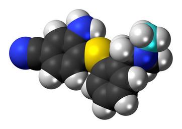Keywords: (C-11)DASB molecule spacefill.png Space-filling model of the C-11DASB molecule a compound used in PET scans The radioactive carbon-11 atom is highlighted in cyan C H N S C cyan <sup>11</sup>C Radioactive carbon 2015-01-09 own DS Visualizer Jynto more from this user With radioactive marker ball-and-stick version Without radioactive marker ball-and-stick version Without radioactive marker space-filling version cc-zero Images by Jynto Space-filling models Diphenylsulfids Benzonitriles Dimethylamino compounds Anilines |