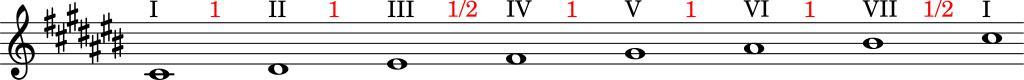 Keywords: C sharp major scale with degrees and tones.svg en C sharp major scale with degrees and tones fr Gamme de do majeur avec ses degrés et l'indication des tons 2014-03-01 11 12 40 own Romainbehar LilyPond source <pre> \version 2 16 2 \new Staff \with \remove Time_signature_engraver \set Score defaultBarType empty \clef treble \key cis \major cis'1 \markup I \once \override NoteHead 'transparent t eis \markup \with-color red 1 dis'1 \markup II \once \override NoteHead 'transparent t eis \markup \with-color red 1 eis'1 \markup III \once \override NoteHead 'transparent t eis \markup \with-color red 1/2 fis'1 \markup IV \once \override NoteHead 'transparent t eis \markup \with-color red 1 gis'1 \markup V \once \override NoteHead 'transparent t eis \markup \with-color red 1 ais'1 \markup VI \once \override NoteHead 'transparent t eis \markup \with-color red 1 bis'1 \markup VII \once \override NoteHead 'transparent t eis \markup \with-color red 1/2 cis1 \markup I </pre> cc-zero Uploaded with UploadWizard Musical scales GNU LilyPond images