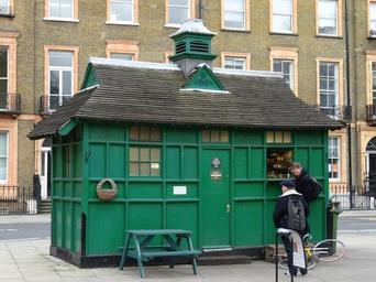 Keywords: outdoor The Cabmen's Shelter Fund was established in London, England, in 1875 to run shelters for the drivers of hansom cabs and later hackney carriages (taxicabs).[1] By law, cab drivers could not leave the cab stand while their cab was parked there. This made it very difficult for them to obtain hot meals and could be unpleasant in bad weather. If they drove to a pub to buy food then they would have to pay somebody to look after their cab while they were inside, otherwise it was likely to be stolen. The Earl of Shaftesbury and other worthies therefore took it upon themselves to set up a charity to construct and run shelters at major cab stands. These shelters were small green huts, which were not allowed to be larger than a horse and cart, as they stood on the public highway. Between 1875 and 1914, 61 of these buildings were built around London. Most were staffed by an attendant who sold food and (non-alcoholic) drink to the cabbies and were provided with a kitchen in which the attendant could cook this food and also food provided by the cabbies themselves. The attendant was not generally paid, but was expected to make an income from these sales. The shelters were also provided with seats and tables and books and newspapers, most of them donated by the publishers or other benefactors. Most could accommodate ten to thirteen men. Gambling, drinking and swearing were strictly forbidden. Thirteen of the shelters still exist and are still run by the Cabmen's Shelter Fund.[2] All are now Grade II listed buildings. They are located at: Chelsea Embankment SW3 - close to junction with Albert Bridge, London Embankment Place WC2 - close to the Playhouse Theatre Grosvenor Gardens SW1 - to the west side of the north gardens Hanover Square, London W1 - on the north side of the central gardens Kensington Park Road W11 - outside numbers 8-10 Kensington Road W8 - close to the junction of Queen's Gate SW7 Pont Street SW1 - close to the junction of Sloane Street Russell Square WC1 - Western Corner (relocated to here from Leicester Square) St. George's Square, Pimlico SW1 - on the north side Temple Place WC2 - opposite side of the road from the Swissötel Howard Thurloe Place, Kensington SW7 - in the middle of the road opposite the Victoria and Albert Museum Warwick Avenue, London W9 - centre of the road, by Warwick Avenue tube station Wellington Place NW8 - near to Lord's Cricket Ground During annual Open House London Heritage Days, the public gets a chance to see inside some of the shelters, normally the exclusive reserve of cab drivers. The Cabmen's Shelter Fund was established in London, England, in 1875 to run shelters for the drivers of hansom cabs and later hackney carriages (taxicabs).[1] By law, cab drivers could not leave the cab stand while their cab was parked there. This made it very difficult for them to obtain hot meals and could be unpleasant in bad weather. If they drove to a pub to buy food then they would have to pay somebody to look after their cab while they were inside, otherwise it was likely to be stolen. The Earl of Shaftesbury and other worthies therefore took it upon themselves to set up a charity to construct and run shelters at major cab stands. These shelters were small green huts, which were not allowed to be larger than a horse and cart, as they stood on the public highway. Between 1875 and 1914, 61 of these buildings were built around London. Most were staffed by an attendant who sold food and (non-alcoholic) drink to the cabbies and were provided with a kitchen in which the attendant could cook this food and also food provided by the cabbies themselves. The attendant was not generally paid, but was expected to make an income from these sales. The shelters were also provided with seats and tables and books and newspapers, most of them donated by the publishers or other benefactors. Most could accommodate ten to thirteen men. Gambling, drinking and swearing were strictly forbidden. Thirteen of the shelters still exist and are still run by the Cabmen's Shelter Fund.[2] All are now Grade II listed buildings. They are located at: Chelsea Embankment SW3 - close to junction with Albert Bridge, London Embankment Place WC2 - close to the Playhouse Theatre Grosvenor Gardens SW1 - to the west side of the north gardens Hanover Square, London W1 - on the north side of the central gardens Kensington Park Road W11 - outside numbers 8-10 Kensington Road W8 - close to the junction of Queen's Gate SW7 Pont Street SW1 - close to the junction of Sloane Street Russell Square WC1 - Western Corner (relocated to here from Leicester Square) St. George's Square, Pimlico SW1 - on the north side Temple Place WC2 - opposite side of the road from the Swissötel Howard Thurloe Place, Kensington SW7 - in the middle of the road opposite the Victoria and Albert Museum Warwick Avenue, London W9 - centre of the road, by Warwick Avenue tube station Wellington Place NW8 - near to Lord's Cricket Ground During annual Open House London Heritage Days, the public gets a chance to see inside some of the shelters, normally the exclusive reserve of cab drivers.
