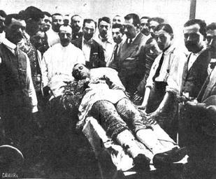 Keywords: Cadáver de Corchaito.png es Fotografía que muestra el cadáver del matador de toros Corchaito en la enfermería de la plaza de toros de Cartagena poco después de fallecer tras ser corneado por un toro 1914-08-09 Mundo Gráfico número 147 de 19 de agosto de 1914 página 23 author other versions Custom license marker 2015 05 08 PD-old-80 1914 deaths 1914 events in Spain August 1914 in Spain 20th-century black and white photographs of Spain Bullfighters from Spain Cartagena Spain in the 20th century Human corpses in Spain Mundo Gráfico bullfighters People of Spain in 1914 Uploaded with UploadWizard |