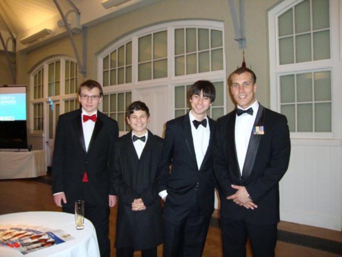 Keywords: Cadets and organiser with LC Matt Croucher RM GC.jpg en Lance Corporal Matt Croucher RM GC poses with The Organiser Philip Day and two Cadets at the Cadet Forces 150th Anniverary Dinner held at the Honourable Artillery Company on 8th January 2010 Own Anon 2010-01-08 Cc-zero Combined Cadet Force |