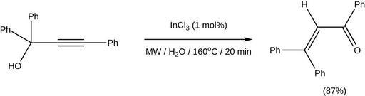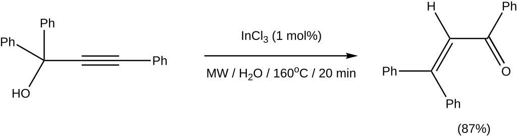 Keywords: Cadierno-microwave-catalysis.svg en A recreation of part of Scheme 2 in Cadierno et al 's 2009 paper in Tetrahedron Letters giving an example of their improvement of the Meyer-Schuster rearrangement own Wijobs 2010-05-04 Microwave Catalysis Meyer-Schuster rearrangement |