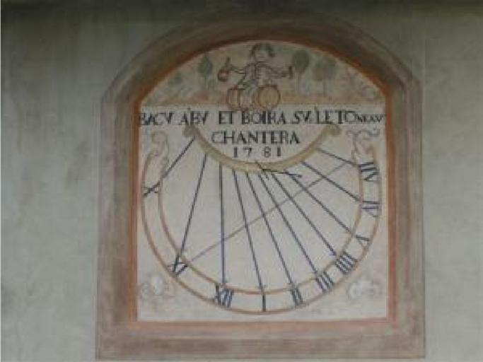 Keywords: Cadran solaire. Hameau du Peuil.PNG Artwork LangSwitch Sundial on the facade of an old inn Cadran solaire sur la façade d'une ancienne auberge <br> LangSwitch Decor Décor LangSwitch Two lilies Deux fleurs de lys LangSwitch Bacchus drink on a barrel in one hand a pitcher and the other a tumbler He wears a wig and is of brocade jacket with breeches which stops at the knees followed by hoses Bacchus boit sur un tonneau un pichet d'une main et une timbale de l'autre Il porte une perruque en ailes de pigeon et revêt une veste de brocart avec une culotte qui s ™arrête aux genoux suivie de bas de chausse LangSwitch The ten strings of a lyre represent hours of the dial of the afternoon They join the soundboard bringing their numbers in Roman numerals The rod is T There is an equatorial line Les dix cordes d'une lyre représentent les heures de ce cadran déclinant de l'après-midi Elles joignent la table d'harmonie qui porte leurs numéros en chiffres romains Le style est en T Il existe une ligne équatoriale 1781 Technique mural place of discovery object history exhibition history credit line LangSwitch Motto Devise <br> LangSwitch Baccus drank and will drink and will sing on the barrel BACV A'BV ET BOIRA SU<small>R</small>'LE TO<small>NEAV</small> CHANTERA 1781 LangSwitch Restored by the workshop Tournesol in 2000 Restauré par l'atelier Tournesol en 2000 <br> LangSwitch See Voir <gallery>File Cadran solaire Lans-en-Vercors Peuil Notice explicative JPG Notice explicative Cadran solaire du Peuil </gallery> Société astronomique de France 3820501-1 Numéro d'identification de la Société astronomique de France S A F 3820501-1 Isère accession number place of creation Hameau du Peuil Lans en “Vercors Isère France cite web Balades en Isère Lans-en-Vercors https //baladesenisere wordpress com/tag/lans-en-vercors/ 2015 05 15 2015 09 06 fr PD-old-100 cite web Atelier Tournesol Cadrans restaurés 2000 Lans-en-Vercors ancienne auberge au hameau du Peuil Isère http //atelier tournesol free fr/ 11 2012 06 09 2015 fr cite web Gaëlle Yeretzian Anne Cayol-Gerin Département de l'Isère Patrimoine de l'Isère Bases de données Décors Lans-en-Vercors http //www isere-patrimoine fr/TP 20L_CODE/TPL_SITEPATRIMONIAL/PAR_TPL_IDENTIFIANT/119/1272-base htm 2015 09 10 fr Uploaded with UploadWizard Vertical sundials in France Sundials in Isère Lans-en-Vercors |