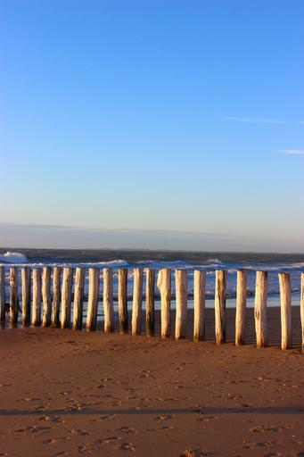 Keywords: cadzand-bad netherlands holland north sea beach summer july sky landscape nature blue distant sand rest idyll mood holzbuhne breakwater illuminated tracks in the sand traces