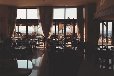 Keywords: cafe restaurant interior furniture retro vintage bar drink lunch decoration eat elegant big terrace curtains windows view event place dinner table chairs