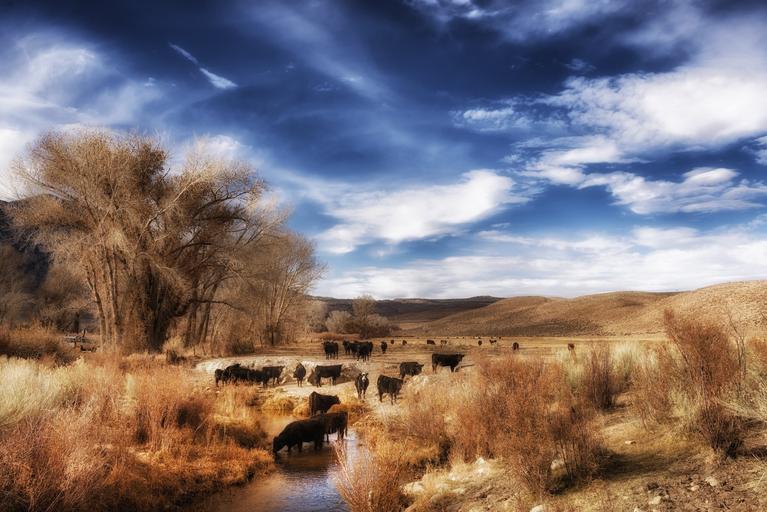 Keywords: california landscape scenic sky clouds cattle animals stream creek water plants trees brush farm ranch nature outside country countryside hdr