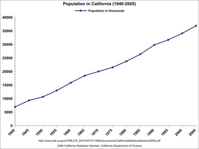Keywords: California Population 1940-2005.svg en Population of California in thousands 1940-2005 Source http //www dof ca gov/HTML/FS_DATA/STAT-ABS/documents/CaliforniaStatisticalAbstract2008 pdf 2008 California Statistical Abstract own Urban 2009-05-01 Demographics of California |