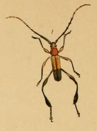 Keywords: Callichromopsis telephoroides.jpg Cropped from File CabinetOrientalEntomology29 jpg Cerambyx telephoroides <small>Westw </small> Callichromopsis telephoroides <small> Westwood 1848 </small> en Original text accompanying plate FIGURE 1 CERAMBYX s ”g nov TELEPHOROIDES Westw <br/> Cerambyx depressus thoracis lateribus inermibus elytris apice trimcatis antennis corpore longioribus pedibus elongatis femoribus clavatis tibiis posticis dilatatis ; testaceus setoso-sericeus elytris fulvis apicibus nigris antennis nigris apice fuscis articulis 7 et 8 albidis ; pedibus nigris femoribus basi fulvis <br/> Cerambyx with the body depressed the sides of the thorax not spinal the elytra with the tips truncate the antenna; longer than the body the legs long with the thighs thickened and the posterior tibia; dilated testaceous setose-silky opaque with the elytra fulvous the tips black ; the antennae black with brown tips the 7th and 8th joints buff coloured legs black the femora fulvous at the base <br/> Length of the insect 6 lines Inhabits Ceylon In the Collection of R Templeton Esq 1848 Cabinet of Oriental Entomology plate XXIX ORDER - COLEOPTERA Section - Longicornes Family - Cerambycidae Leach J O Westwood PD-old-100 File CabinetOrientalEntomology29 jpg John Obadiah Westwood Callichromopsis telephoroides |