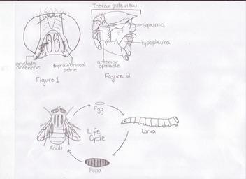 Keywords: Calliphora latifrons.jpg en Frontal face lateral throax and lifecycle picture representation own Pyrothansia 03/22/09 own work Arthropoda drawings