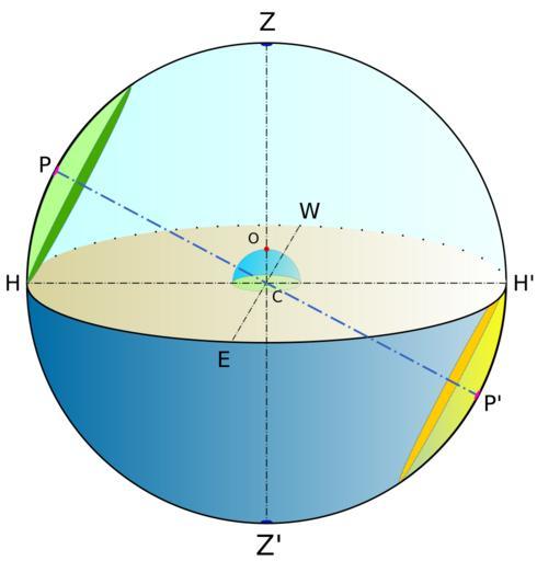Keywords: Calotte celesti visibile e invisibile.svg Sfera celeste sono evidenziate le calotte di perpetua visibilità e di perpetua invisibilità P è il polo celeste elevato P' il polo celeste depresso Z lo Zenith Z' il Nadir C il centro della Terra e della sfera celeste O l'osservatore sulla superficie terrestre Celestial sphere with poles C is the center of the celestial sphere O is the observer Himmelskugel mit Himmelspole O ist der Beobachter Z ist der Zenit Z' ist Nadir P ist der Himmelsnordpol P' ist der Himmelssüdpol Own 2006-12-08 CAV <gallery> Calotte celesti visibile e invisibile svg Emisferi celesti svg Hemisferio celeste svg Poli celesti svg </gallery> Astronomy sketches Celestial coordinate systems Celestial spheres |