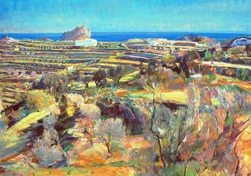 Keywords: outdoor spain españa blanca costa calpe peñon-de-ifach peñondeifach rock sea mediterranean hubertine-heijermans hubertineheijermans artistpainter 1998 on.canvas oncanvas Calpe is a Mediterranean fishing harbor one passes when going south towards Alicante. A large rock called 'Peñon of Ifach' at the entrance of the harbor protects to the North. The land behind the harbor rises steeply, before it stretches out into lush olive groves and terraces with vineyards as far as the eye can see. A small part underneath with a vineyard and the artist's signature are missing. en.wikipedia.org/wiki/Calp En français: Calpe est un port de pêche bien protégé derrière un grand rocher du nom de Peñon de Ifach. Le pays autour consiste de terrasses couvertes d'oliveraies, des vergers d'amandiers. On se trouve dans la Province d'Alicante. Calpe is a Mediterranean fishing harbor one passes when going south towards Alicante. A large rock called 'Peñon of Ifach' at the entrance of the harbor protects to the North. The land behind the harbor rises steeply, before it stretches out into lush olive groves and terraces with vineyards as far as the eye can see. A small part underneath with a vineyard and the artist's signature are missing. en.wikipedia.org/wiki/Calp En français: Calpe est un port de pêche bien protégé derrière un grand rocher du nom de Peñon de Ifach. Le pays autour consiste de terrasses couvertes d'oliveraies, des vergers d'amandiers. On se trouve dans la Province d'Alicante. |