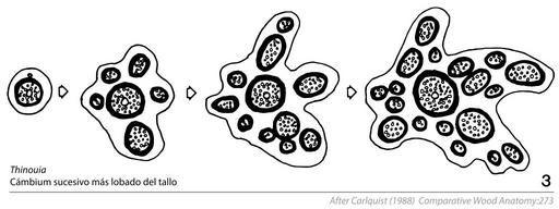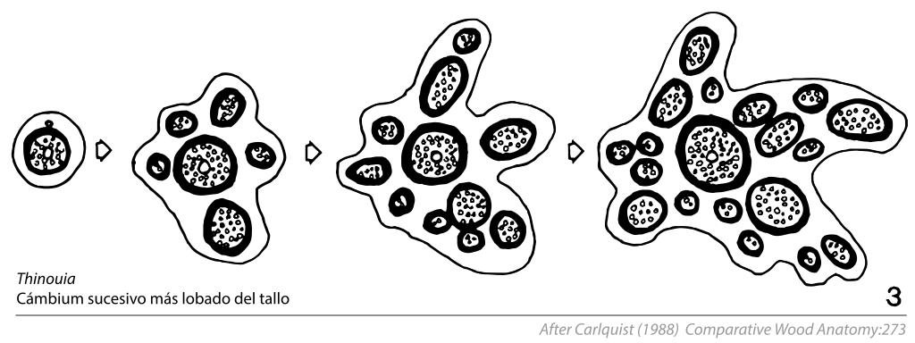 Keywords: Cambial Variants (Anomalous Secondary Growth) Fig. 8.7.3 Thinouia (in Spanish).svg en Fig 8 7 Stems fo lianas that show a combination of cambial variants machaerium combines flattened stems with succesive cambia Mendoncia has interxylary phloem plus fragmentation of the cambium into segments Thinouia has a kind of succesive cambial activity origin of strands of vascular tissue in cortex plus lobed stems in Fig 8 4 Conventions for this and other figures in this chapter black phloem blank with circles indicating vessels xylem; stippled axial parenchyma vertical or variously diagonal lines in pairs rays 1988-01-01 S Carlquist 1988 p 273 Fig 8 7 Chapter 8 Cambial Variants Anomalous Secondary Growth In Comparative Wood Anatomy Part of the series Springer Series in Wood Science Springer Verlag Berlin Heidelberg S Carlquist 1988 other versions Custom license marker 2016 05 08 Tracing data from a scientific diagram taken from primary scientific literature not the scope of copyright laws PD-ineligible Equivalent to cc-0 Wood anatomy Thinouia |