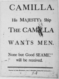 | Keywords: Camilla-1778.jpg From http //hdl loc gov/loc rbc/rbpe 14500300 Full text <nowiki> Begin handwritten 1778 End handwritten CAMILLA His MAJESTY's Ship THE CAMILLA WANTS MEN Begin stamped text Omitted text 2l End stamped text None but Good SEAMEN will be received Printed by James Humphreys junr in Market-street between Front and Second-streets Begin handwritten 24 End handwritten </nowiki> PD-old United States Merchant Marine | ||||