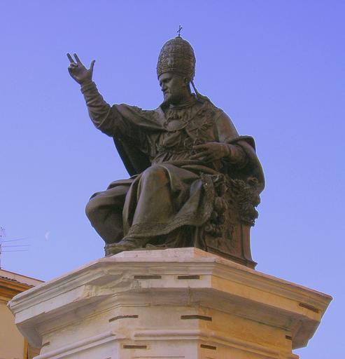| Keywords: Camillo Borghese è il Pontefice Paolo V (Paulus V) al centro di Piazza Cavour a Rimini.jpg Camillo Borghese è il Pontefice Paolo V Paulus V che siede dal 1615 sul trono al centro di Piazza Cavour a Rimini La statua fu eretta come ringraziamento della città al nuovo pontefice che nominò cardinale il riminese Michelangelo Tonti già arcivescovo di Nazareth mentre al contrario il papa precedente Clemente VIII mortificò la città assoggettandone il vescovo all'arcivescovo di Ravenna Paolo V eletto al soglio nel 1605 adottò prontamente il figlio della sorella Ortensia Caffarelli e lo nominò cardinale all'età di soli 29 anni Il figlio-nipote prese così il cognome dello zio-Papa; si trattava del Cardinale Scipione Caffarelli-Borghese eclettico mecenate e collezionista romano che con Paolo V appunto concretò il sogno di creare a Roma un grande parco che testimoniasse la grandezza della loro famiglia E' il famoso parco di Villa Borghese che ospita la collezione d'arte della nobile famiglia di origine senese tra le cui opere si annoverano anche Caravaggio Bernini Raffaello e Tiziano Paolo V morì nel 1621 il figlio-nipote Cardinale Scipione Caffarelli-Borghese nel 1633 La statua di Piazza Cavour risale al 1613 ma il suo copricapo attuale fu ripristinato solo nel 1890 Infatti temendo ritorsioni dell'esercito napoleonico nel 1800 la tiara originaria fu sostituita con la mitra e l'iscrizione venne sostituita con un'altra che indicava nella figura rappresentata San Gaudenzo patrono di Rimini non un pontefice 2007-03-30 own assumed Mircobotteghi Monument to Paulus V Rimini 1613 bronze statues in Italy |