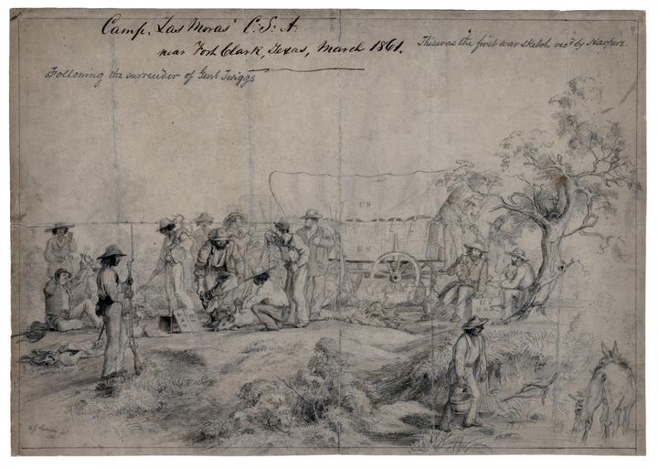 Keywords: photo border sketch drawing text outdoor Detailed study of Confederate troops and Mexicans opening supply boxes taken from a Union covered wagon, drinking and changing clothes. Carl G. von Iwonski; March 1861 Inscribed in pencil upper right: This was the first war sketch recd by Harpers. Inscribed in pencil below title: Following the surrender of Genl. Twiggs. Inscribed on supply boxes: Q[uarter] M[aster] D[epot]. Former U.S. Troops enroute to occupy forts as Confederate soldiers, according to Harper's. Published in: Harper's Weekly, 15 June 1861, p. 375, as: Bivouac of Confederate Troops on the Las Moras, Texas with Stolen U.S. Wagons, Etc.-Sketched by a Member of the Corps. www.loc.gov/pictures/item/2004661291/ Detailed study of Confederate troops and Mexicans opening supply boxes taken from a Union covered wagon, drinking and changing clothes. Carl G. von Iwonski; March 1861 Inscribed in pencil upper right: This was the first war sketch recd by Harpers. Inscribed in pencil below title: Following the surrender of Genl. Twiggs. Inscribed on supply boxes: Q[uarter] M[aster] D[epot]. Former U.S. Troops enroute to occupy forts as Confederate soldiers, according to Harper's. Published in: Harper's Weekly, 15 June 1861, p. 375, as: Bivouac of Confederate Troops on the Las Moras, Texas with Stolen U.S. Wagons, Etc.-Sketched by a Member of the Corps. www.loc.gov/pictures/item/2004661291/ |