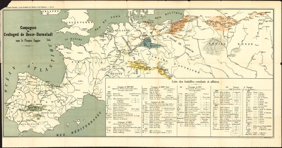 Keywords: Campaigns of the Hesse-Darmstadt Contingent Under the First Empire WDL50.png Artwork ru Созе Жан-Камиль-Абель-Фле и Родился в 1859 г fr Sauzey Jean-Camille-Abel-Fleuri Né en 1859 en Sauzey Jean-Camille-Abel-Fleuri Born 1859 zh Sauzey 让-卡米 -阿 尔-费 伟 生于1859年 pt Sauzey Jean-Camille-Abel-Fleuri nascido em 1859 ar ساوزي جان-كميل-ابيل-فليري مواليد 1859 es Sauzey Jean-Camille-Abel-Fleuri nacido en 1859 ru Военные кампании контингента Гессен-Да мштадта п и пе вой импе ии fr Campagnes du contingent de Hesse-Darmstadt sous le Premier Empire en Campaigns of the Hesse-Darmstadt Contingent Under the First Empire zh 第 国时 黑森州的竞 活动 pt Campanhas do Contingente Hesse-Darmstadt sob o Primeiro Império ar حملات لوحدة الهيس - دارمشتات تحت الإمبراطورية الأولى ru В ходе наполеоновских войн в начале XIX века многие немцы с ажались на сто оне Ф анцузской импе ии После победы над Авст ией и Россией оде жанной во в емя битвы п и Аусте лице в декаб е 1805 года   аполеон объединил 16 немецких княжеств анее входивших в состав Священной Римской импе ии в Рейнскую конфеде ацию под уп авлением Ф анции После чего аполеон низложил и Священную Римскую импе ию Госуда ства-члены конфеде ации были вынуждены отп авлять свои воинские части и солдат для подде жки наполеоновских а мий а этой ка те и в п илагающейся к ней таблице показаны боевые действия в кото ых п инимали участие воинские части Гессен-Да мштадта с ажаясь на сто оне ф анцузской а мии на те ито ии цент альной Ев опы Испании а также во в емя наступления на Россию в 1812 году Эта ка та составлена на основе езультатов исследования лейтенанта-полковника Жана-Камиля Абеля-Флюи и Сози ф анцузского офице а и исто ика в 1902-12 гг опубликовавшего шеститомный т уд посвященный воинскому контингенту из Ге мании в составе ф анцузской а мии <br> аполеоновские войны 1800-1815 гг fr Pendant les guerres napoléoniennes du début du XIXe siècle beaucoup d'Allemands combattirent du côté de l'Empire français Après sa victoire sur l'Autriche et la Russie en décembre 1805 à la bataille d'Austerlitz  Napoléon regroupa 16 États allemands qui faisaient partie du Saint Empire romain germanique en une Confédération du Rhin sous contrôle français Il dissolut ensuite le Saint Empire romain germanique Les États membres de la Confédération étaient contraints de fournir des unités militaires et des soldats aux armées de Napoléon Cette carte et le tableau l'accompagnant montrent les engagements militaires auxquels les unités de Hesse-Darmstadt prirent part lorsqu elles se battaient pour les Français en Europe centrale en Espagne et pendant l'invasion de la Russie en 1812 Cette carte est fondée sur les recherches du lieutenant-colonel Jean-Camille Abel-Fleuri Sauzey officier et historien français qui publia de 1902 à 1912 une étude en six volumes des contingents allemands dans l'armée française <br>Guerres napoléoniennes 1800-1815 en During the Napoleonic Wars of the early 19th century many Germans fought on the side of the French Empire After Napoleon defeated Austria and Russia in the December 1805 Battle of Austerlitz he grouped 16 German states that were part of the Holy Roman Empire into a French-controlled Confederation of the Rhine He then dissolved the Holy Roman Empire The states that were members of the confederation were compelled to supply military units and soldiers to Napoleon s armies This map and the accompanying table show the military engagements in which units from Hesse-Darmstadt were involved while fighting for the French in central Europe Spain and in the 1812 invasion of Russia The map is based on the research of Lt -Colonel Jean-Camille Abel-Fleuri Sauzey a French military officer and historian who published in 1902-12 a six-volume study of the German contingents in the French army <br>Napoleonic Wars 1800-1815 zh 19 世纪早 的拿破仑战争 间,许多德国人 为法兰西 国打仗 1805 年 12 拿破仑 奥斯特利茨战役打败俄奥联军后,他将当时 为神 罗马 国 部分的德国 16 州归入了法控莱茵河联邦 随后,拿破仑解散了神 罗马 国 这些成为联邦成员的各州被迫为拿破仑的军队提供部队和士兵 该 图和 附的表格显示西·达姆斯达德的军队为法国 中欧 西班牙以及 1812 年进攻俄国进行的军事行动 这幅 图根据的是陆军中校 Jean-Camille Abel-Fleuri Sauzey 的研究 他是 名法国军官 位历史学家, 1902-12 年 间出版了六卷研究法军中德国分遣队的著 <br>拿破仑战争,1800-1815 年 pt Durante as guerras napoleônicas do início do século XIX muitos alemães lutaram ao lado do Império Francês Depois que Napoleão derrotou a Áustria e a Rússia na Batalha de Austerlitz em dezembro 1805  ele reuniu 16 estados alemães que faziam parte do Sagrado Império Romano para formar a Confederação do Reno controlada pela França Ele dissolveu então  o Sagrado Império Romano Os estados que eram 
