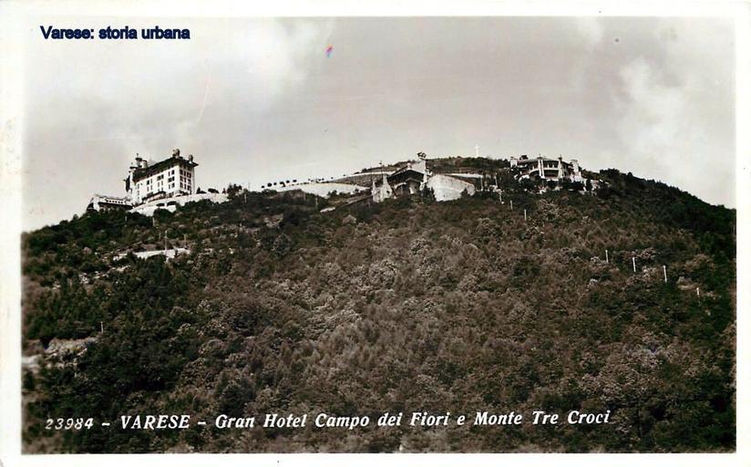 Keywords: Il complesso turistico del Campo dei Fiori. A sinistra il Grand Hotel (terminato nel 1912) al centro la stazione a monte della funicolare e a destra il Ristorante Campo dei Fiori (entrambe completate nel 1911). Tutte e tre le opere sono state progettate dall'arch. Giuseppe Sommaruga tra il 1908 e il 1910. In alto le tre croci (1901). varese campodeifiori |