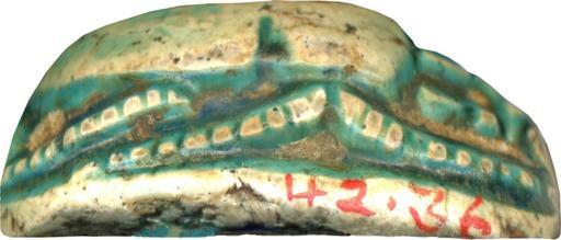 Keywords: Canaanite - Scarab with Walking Lion Design - Walters 4236 - Right.jpg The ancient Egyptians believed that the dung beetle the Scarabaeus sacer was one of the manifestations of the sun god Representations of these beetles were used as amulets and for ritual or administrative purposes This scarab displays on its bottom the motif of a walking lion The mouth of the animal is wide open and the tail raised upon its back A sun disk appears below its head an nb-basket below its belly a bush between its hindlegs and further floral elements behind its body The lion figure fills nearly the whole space; only in front between and behind its extremities is some space to convey the environment The figure of the lion has a short body a large head and slim legs with very large paws The size and round shape of these paws correspond to the form of the sun disk The layout is balanced and tightly packed the figure of the lion and the other elements fill the whole space and there is empty space only between the frontlegs of the lion The head of the lion is on the bottom of the head segment of the scarab The highest point of the back is the pronotum dorsal plate of the prothorax Two side-notches at shoulder height which differ in depth and are not totally aligned define the partition between pronotum and elytron wing cases The triangular head has incised borderlines; the irregular side plates have side-notches and the four times serrated clypeus a short central base notch The raise extremities have natural form and diagonal hatch lines for the tibial teeth and pilosity hair ; the background is deeply hollowed out The oval base is symmetrical and the drill-hole openings framed The scarab is longitudinally pierced was originally mounted or threaded and functioned as a protective amulet with royal connotation Particularly it refers to divine royal power lion and solar presence sun disc as a life spending force plants and should assure protection and renewal for its owner There are several parallels for this motif on the bottom of scarabs The type with an open mouth is typical for examples from Palestine Lion icons have royal and heavenly connotations and the sub-icons specify or modify the exact meaning ca 1648 1539 BC Second Intermediate; late MB IIB light beige steatite with green-blue glaze cm 0 9 1 5 2 1 accession number 42 36 34037 Henry Walters Baltimore date and mode of acqusition unknown Walters Art Museum Henry Walters Acquired by Henry Walters place of origin Palestine Walters Art Museum license Ancient Near East art in the Walters Art Museum Canaanite art Media contributed by the Walters Art Museum needs category review