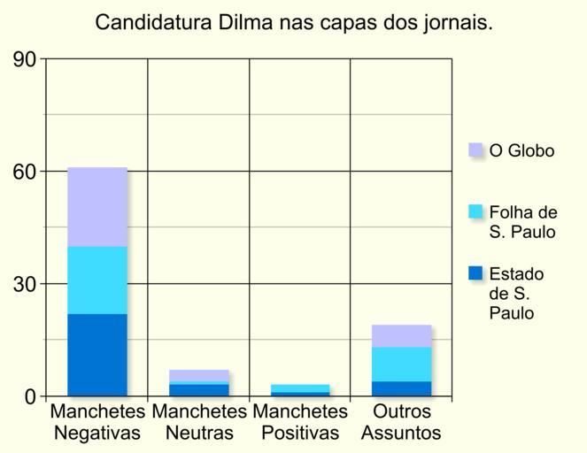 | Keywords: Candidatura Dilma nas capas dos jornais.png O portal Brasil de Fato realizou um levantamento sobre o comportamento dos três jornais de maior circulação no Brasil ante a campanha de Dilma Rousseff candidata do PT para a Presidência da República em 2010 http //www brasildefato com br/node/3320 O estudo foi feito a partir das manchetes de primeira página publicadas em 30 dias que antecederam a votação de primeiro turno entre os dias 28 de agosto e 27 de setembro Constatou-se que a maior parte dos temas abordados foram ligados às eleições com a grande maioria das manchetes adotando um enfoque desfavorável para a candidata do PT No período analisado O Globo não publicou nenhuma manchete positiva à candidata do PT contra 21 manchetes negativas Foram ainda três neutras e seis tratando de outros assuntos como Economia ou Internacional Já a Folha de S Paulo veiculou duas manchetes positivas à campanha petista Lula vai à TV e afirma que Serra partiu para baixaria no dia 8 e Desemprego é o menor e renda é a maior em 8 anos no dia 24 No entanto foram dezoito manchetes negativas além de uma neutra e nove sobre temas diversos O Estado de S Paulo único dos três a declarar em editorial apoio ao candidato José Serra foi o campeão em negativas com relação a Dilma foram 22 capas negativas em apenas um mês O Estado trouxe uma manchete positiva à petista Inquérito da PF esvazia tese de crime político na receita no dia 16 três neutras e quatro abordando outros assuntos 2010-11-15 own assumed Leinad-Z~commonswiki Cc-zero Check categories 2010 November 16 pt wikipedia Partido_da_Imprensa_Golpista 3 Media of Brazil Magazines of Brazil Internet memes |