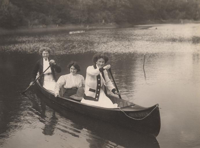 Keywords: canoes and canoeing canoesandcanoeing women monochrome outdoor Photographer: Reuben R. Sallows (1855 - 1937) Description: Three young women paddling in a canoe with bow in lower right corner; subjects face the photographer; woman on right wears light coloured striped skirt, light coloured blouse with brooch at neck and dark cardigan; woman seated in middle wears dark skirt, striped blouse; woman on right wears light coloured skirt, blouse and sweater with black trim; all have upswept hair; treed shoreline in background; title and date (1910/52) in pencil and Sallows stamp in purple ink on back; writing in ink on back identifies subjects as Florence Sallows Saunders, Josie Saunders and friend Object ID : 0412-rrs-ogohc-ph View additional photographs by Sallows that are held in other collections at the Reuben R. Sallows Digital Library. Order a higher-quality version of this item by contacting the Huron County Museum (fee applies). Photographer: Reuben R. Sallows (1855 - 1937) Description: Three young women paddling in a canoe with bow in lower right corner; subjects face the photographer; woman on right wears light coloured striped skirt, light coloured blouse with brooch at neck and dark cardigan; woman seated in middle wears dark skirt, striped blouse; woman on right wears light coloured skirt, blouse and sweater with black trim; all have upswept hair; treed shoreline in background; title and date (1910/52) in pencil and Sallows stamp in purple ink on back; writing in ink on back identifies subjects as Florence Sallows Saunders, Josie Saunders and friend Object ID : 0412-rrs-ogohc-ph View additional photographs by Sallows that are held in other collections at the Reuben R. Sallows Digital Library. Order a higher-quality version of this item by contacting the Huron County Museum (fee applies). |