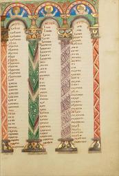 Keywords: Canon Table Page - Google Art Project (6850296).jpg None 430703 Unknown /collection/the-j-paul-getty-museum/artwork/canon-table-page-unknown/6850296/ Unknown illuminator /collection/the-j-paul-getty-museum/ The J Paul Getty Museum 343005 http //www getty edu/museum 3/12/2012 5 14 40 PM /collection/the-j-paul-getty-museum/artwork/canon-table-page-unknown/6850296/ 1120 about 1120 - 1140 Saint Luke Saint Mark Saint Matthew Tempera colors gold and silver on parchment 229 6850296 True 1140 3/25/2012 2 00 39 PM lido getty edu-gm-obj110037 http //www getty edu/art/gettyguide/artObjectDetails artobj 110037 http //www getty edu/legal/copyright html Folio 1120 1150 Helmarshausen Germany Creation w165 x h229 cm about 1120 - 1140 False 0 67578125 Part canon-table-page-unknown Canon Table Page c 165 Tempera colors gold and silver on parchment Saint Luke Saint Mark Saint Matthew http //www getty edu/legal/copyright html special url_id uAFIPV1TESrg1Q PD-old-100 MS LUDWIG II 3 Getty museum - Gospel book from Helmarshausen Canon tables Google Art Project works by unknown artist |