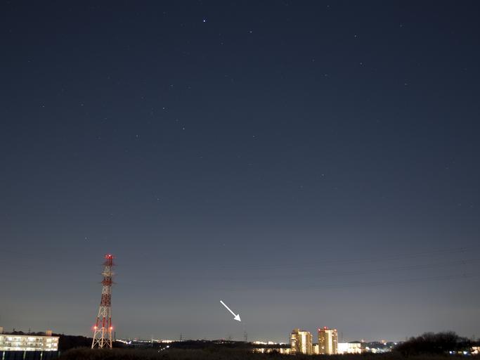 Keywords: Canopus seen from Tokyo.jpg Canopus was seen about 2 degrees above the horizon It shines orange due to its low height It reached the meridian 1 minute before It was a little bit hard to see Canopus by naked eyes but it was clearly seen by binoculars You can see Sirius near the upper edge カノープス <br /> 撮影日時 2009年12 28日 23時38分19秒 固定撮影 ISO200 出20秒 F 3 5 焦点 離18mm<br /> 撮影機 Nikon D5000 AF-S DX NIKKOR 18-55mm F3 5-5 6G VR<br /> 撮影 京都稲城市長峰3丁目(北緯35度37分55 09秒 経139度28分36 75秒 標高125m)<br /> メモ カノープスのこの日の南中は23時37分 撮影時の高度は約2度 高度が低いためオレンジ色に見える 双 鏡では容易に見えるが 肉 ではかすかに見える程度 上に写っている明るい星はおおいぬ座のシリウス own Nikm 2009-12-28 35 37 55 09 N 139 28 36 75 E region JP_heading SE Carina constellation Canopus |