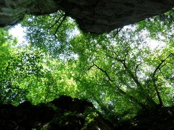Keywords: canopy trees green foliage upward rock cleft rock sheep mountain gorge swabian alb zollernalb alb eaves hike more alb hike excursion day destination swabian alb nordrand route