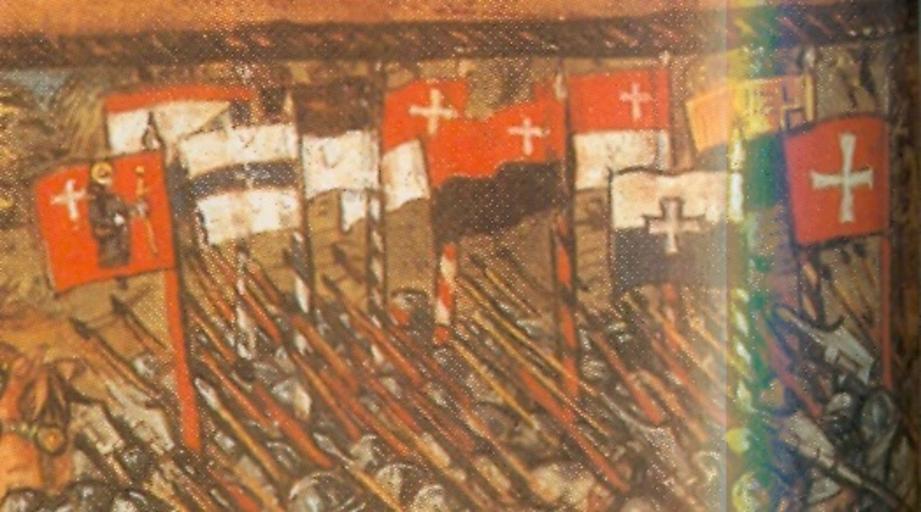 Keywords: Cantonal flags Nancy 1477 1513.jpg en Depiction of the Swiss confederate flags at the battle of Nancy 1477 Detail of the plate depicting the battle in the Luzerner Chronik of Diebold Schilling 1513 All flags of the Eight Cantons are shown but the flags of Berne and Uri omit the heraldic animal showing only the cantonal colours In addition the flags of Fribourg and Solothurn are shown at the time not yet full members who would join the confederacy in the aftermath of this battle in 1481 The flag of the city of Basel is shown separately behind the confederate flags not included in this detail Each flag has the white confederate cross attached those of Schwyz Lucerne and Zug in the center the others in the top corner at the host except for Glarus where it is in the top corner at the fly apparently for reasons of space and for Zürich which is partially obscured behind Zug and Glarus so that no cross is visible but the red Schwenkel at the top of the flag of Zürich is visible 1513 Luzerner Chronik detail of File Deutsche Geschichte5-290 jpg Creator Diebold Schilling PD-old-100 Uploaded with UploadWizard Flags and Coats of arms used by Swiss soldiers 1300-1550 |
