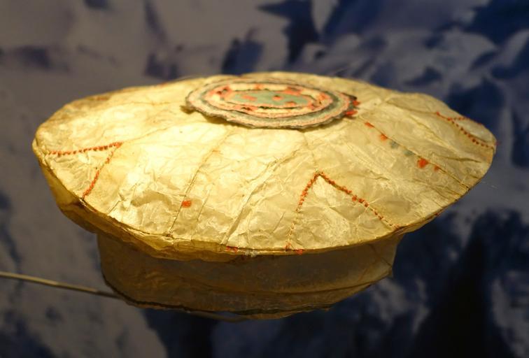 Keywords: Cap, Sitka, Alaska, c. 1906, stitched leather with mammal gut, No. 1906.21.0018 - Etnografiska museet - Stockholm, Sweden - DSC01265.JPG en Exhibit in the Etnografiska museet Stockholm Sweden This work is old enough so that it is in the public domain Photography was permitted in the museum without restriction 2014-09-16 own Daderot other versions cc-zero Arctic collection in the Etnografiska museet Uploaded with UploadWizard Leather clothing Fish leather |