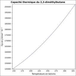 | Keywords: Capacité thermique 2,3-diméthylbutane.svg fr Capacité thermique liquide calculée d'après <br/> Robert H Perry et Donald W Green Perry's Chemical Engineers' Handbook McGraw-Hill USA 1997 7e éd 2400 p ISBN 0-07-049841-5 p 2-170 own Epop 2010-06-28 Created with Gnumeric Heat capacity |