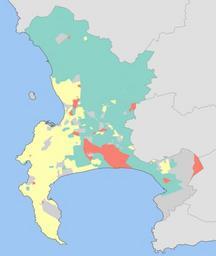 Keywords: Cape Town 2001 dominant language map.svg 8dd3c7 Afrikaans ffffb3 English fb8072 isiXhosa d0d0d0 No language dominant Statistics South Africa's Census 2001 is the source of the basic population data The map results from my own processing of the data Htonl 2010-02-15 Htonl The following license applies to the population data on which the map is based http //www statssa gov za/copyrightdisclaimer asp the user acknowledges Stats SA as the source of the basic data wherever they process apply utilise publish or distribute the data and also that they specify that the relevant application and analysis where applicable result from their own processing of the data The following tag applies to the map itself Linguistic maps of South Africa Maps of Cape Town Maps of metropolitan areas in South Africa Maps by Htonl |
