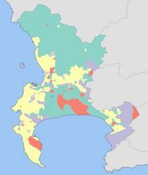 Keywords: Cape Town 2001 dominant population group map.svg fb8072 Black African 8dd3c7 Coloured 80b1d3 Indian or Asian ffffb3 White bebada No group dominant d0d0d0 No population Statistics South Africa's Census 2001 is the source of the basic population data The map results from my own processing of the data Htonl 2010-02-15 Htonl The following license applies to the population data on which the map is based http //www statssa gov za/copyrightdisclaimer asp the user acknowledges Stats SA as the source of the basic data wherever they process apply utilise publish or distribute the data and also that they specify that the relevant application and analysis where applicable result from their own processing of the data The following tag applies to the map itself Demographic maps of South Africa Maps of Cape Town Maps of metropolitan areas in South Africa |