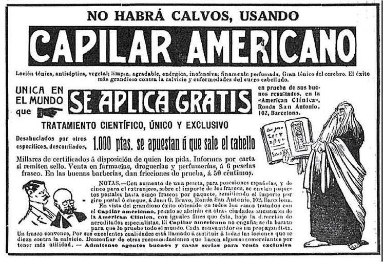 Keywords: Capilar-Americano-1914-08-06-Nuevo-Mundo.jpg es No habrà calvos usando Capilar Americano se aplica gratis en prueba de sus buenos resultados en la American Clinica Ronda San Antonio 102 Barcelona 1914-08-06 Nuevo Mundo Madrid 6 8 1914 Juan Garcia Bravo No habrà calvos usando CAPILAR AMERICANO Locion tonica antiseptica vegetal limpia agradable energica inofensiva finamente perfumada Gran tonico del cerebro El exito mas grandioso contra la calvicie y enfermedades del cuero cabelludo Unica en el mundo que SE APLICA GRATIS tratamiento scientifico unico y exclusivo En prueba de sus buenos resultados en la American Clinica Ronda San Antonio 102 Barcelona Desahuciados por otros especificos Desconfiados 1 000 PTAS SE APUESTAN A QUE SALE EL CABELLO Millares de certificados a disposicion de quien los pida Informes por carta si remiten sello Venta en farmacias droguerias y perfumerias a 6 pesetas frasco En las buenas barberias dan fricciones de prueba a 50 centimos NOTAS - Con aumento de una peseta para posesiones españolas y de cinco para el extranjero sobre el importe de los frascos se envian paquetes postales hasta cinco frascos por paquete remitiendo el importe por giro postal ò cheque a JUAN G BRAVO Ronda San Antonio 102 Barcelona En vista del grandioso exito obtenido en todos los casos tratados con el Capilar americano pronto se habriran en otras ciudades sucursales de la American Clinica con iguales fines que esta bajo la direccion de acreditados especialistas El Capilar americano no engaña; se da barato para que lo pruebe todo el mundo Cada consumidor es un propagandista Un frasco convence por su excelentes cualidades està llamado a sustituir a todas las lociones que se dicen contra la calvicie desconfiar de otras recomendaciones que hacen algunos comerciantes por tener mas utilidad “ Admitense agentes buenos y casas serias para venta exclusiva PD-old Capilar Americano Capilar Americano Nuevo Mundo 1914 advertisements in Spain Juan Garcia-Bravo Menendez American Clinica ronda de San Antonio 102 Uploaded with UploadWizard