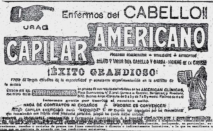 Keywords: Capilar-Americano-1916-11-29-Enfermos-del-cabello.jpg it Capilar Americano annuncio su ABC di Madrid del 29 11 1916 http //hemeroteca abc es/detalle stm ABC Madrid 29 11 1916 pag 19 ABC 1916-11-29 Enfermos del CABELLO usas CAPILAR AMERICANO poderoso regenerador vitalizante antiseptico Salud y vigor del cabello y barba higien de la cabeza EXITO GRANDIOSO fruto de largos estudios y constante experimentacion en la pratica de la misma Unico en el mundo que SE APLICA GRATIS en prueba de sus resultados infalibles en las AMERICAN CLINICAS Plaza Buensuceso n 2 pral junto a la Rambla Barcelona; y Rivadavis 3170 Buenos Ayres Consulta de 3 a 5 y de 7 a 8 y media Festivos de 10 a 12 Enformes gratis por escrito si remite sello Nada de contratos ni engaƱos Probar es convencer Exigir CAPILAR AMERICANO marco MEZQUIDA si no quieres ser engaƱado por los semejantes que recomendian con interes otros productos parecidos porquƩ les queda mayor utilidad y farmacias importantes a 6 pesetas FRASCO Por 7 pesetas remitimos PD-old ImageNote 1 34 22 992 573 1033 639 2 Enfermos del CABELLO usas CAPILAR AMERICANO poderoso regenerador vitalizante antiseptico Salud y vigor del cabello y barba higien de la cabeza EXITO GRANDIOSO fruto de largos estudios y constante experimentacion en la pratica de la misma Unico en el mundo que SE APLICA GRATIS en prueba de sus resultados infalibles en las AMERICAN CLINICAS Plaza Buensuceso n 2 pral junto a la Rambla Barcelona; y Rivadavis 3170 Buenos Ayres Consulta de 3 a 5 y de 7 a 8 y media Festivos de 10 a 12 Enformes gratis por escrito si remite sello Nada de contratos ni engaƱos Probar es convencer Exigir CAPILAR AMERICANO marco MEZQUIDA si no quieres ser engaƱado por los semejantes que recomendian con interes otros productos parecidos porquƩ les queda mayor utilidad y farmacias importantes a 6 pesetas FRASCO Por 7 pesetas remitimos ImageNoteEnd 1 Capilar Americano Capilar Americano ABC Madrid ABC advertisements 1916 advertisements in Spain American Clinica plaza Buensuceso 2 |