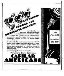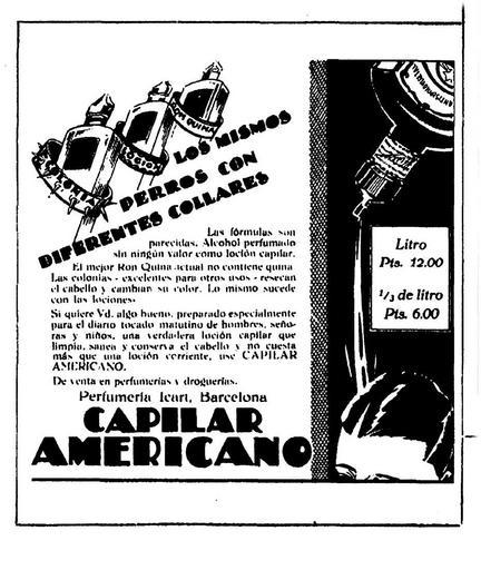Keywords: Capilar-Americano-1930-02-07-Vanguardia.jpg es Capilar Americano - los mismos perros con diferentes collares 1930-02-07 La Vanguardia Barcelona 7 2 1930 pag 3 Icart LOS MISMOS PERROS CON DIFERENTES COLLARES Las formulas son parecidas Alcohol perfumado sin ningun valor como locion capilar El mejor Ron Quina actual no contiene quina Las colonias - excelentes para otro usos “ resecan el cabello y cambian su color Lo mismo succede con las lociones Si quiere Vd Algo bueno preparado especialmente para el diario tocado matutino de hombres senoras y ninos una verdadera locion capilar que limpia sanea y conserva el cabello y no cuesta mas que una locion corrIente use CAPILAR AMERICANO De venta en perfumerias y droguerias Perfumeria ICART Barcelona CAPILAR AMERICANO Litro pts 12 00 1/3 de litro pts 6 00 PD-old Capilar Americano Capilar Americano Vanguardia 1930 advertisements in Spain Perfumeria Icart Barcelona ImageNote 1 79 287 507 623 930 1102 2 LOS MISMOS PERROS CON DIFERENTES COLLARES Las formulas son parecidas Alcohol perfumado sin ningun valor como locion capilar El mejor Ron Quina actual no contiene quina Las colonias - excelentes para otro usos “ resecan el cabello y cambian su color Lo mismo succede con las lociones Si quiere Vd Algo bueno preparado especialmente para el diario tocado matutino de hombres senoras y ninos una verdadera locion capilar que limpia sanea y conserva el cabello y no cuesta mas que una locion corrIente use CAPILAR AMERICANO De venta en perfumerias y droguerias Perfumeria ICART Barcelona CAPILAR AMERICANO ImageNoteEnd 1 ImageNote 2 732 448 143 178 930 1102 2 Litro pts 12 00 1/3 de litro pts 6 00 ImageNoteEnd 2 |