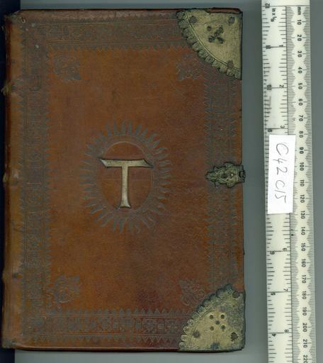 Keywords: Capitoli de la fraternita del glorioso misser sancto Antonio in la citta de Pesaro. G.L. On vellum. (? Pietro de Capha a nome de Hieronymo Soncino- Pesaro, -1515.-) - - Upper cover (c42c15).jpg Style Circle Panel design Flames or rays; Caption Upper cover; Colour Brown; Edge Unspecified exhibition history Decorative Technique Tooled in blind Tooled in gold; Cover Material Goatskin includes morocco turkey etc Wooden boards The tooling is probably gold which has oxidised With metal cornerpieces remains of 1 clasp and the letter T on upper and lower cover which Stephen Parkin suggests maybe signifies the Tau cross of St Anthony Vellum leaves 1 metal clasp metal cornerpieces along fore edge corners only object history Text 1515; Pesaro; Fraternita de Antonio Pesaro object type Cc-zero place of creation Binding Italy place of discovery See HUSUNG Max Joseph Bucheinbände aus der Preussischen Staatsbibliothek in Berlin in historischer Folge erläutert Leipzig Verlag Karl Hiersemann 1925 fig 82 plate lii; QUILICI Piccarda Legature antiche e di pregio Sec XIV-XVIII 2 tomi Roma Istituto Poligrafico e Zecca dello Stato 1995 II p 239 fig 373; VIANINI TOLOMEI Guido Catalogo in Legatura romana barocca 1565-1700 Roma Edizioni Carte Segrete 1991 pp n 40 p 104 I am grateful to Dr Macchi for details of this binding British Library image http //www bl uk/catalogues/bookbindings/LargeImage aspx RecordId 020-000012284 ImageId ImageId 45747 Copyright BL Capitoli de la fraternita del glorioso misser sancto Antonio in la citta de Pesaro G L On vellum Pietro de Capha a nome de Hieronymo Soncino Pesaro 1515 Uploaded with GWToolset Capitoli de la fraternita del glorioso misser sancto Antonio in la citta de Pesaro G L On vellum Pietro de Capha a nome de Hieronymo Soncino Pesaro 1515 - Upper cover c42c15 http //www webarchive org uk/bldatasets/bindings/13259_3 jpg Bookbinding 16th-century bookbinding British Library Bookbindings Capitoli de la fraternita del glorioso misser sancto Antonio in la citta de Pesaro. G.L. On vellum. (? Pietro de Capha a nome de Hieronymo Soncino- Pesaro, -1515.-) - - Upper cover (c42c15).jpg Style Circle Panel design Flames or rays; Caption Upper cover; Colour Brown; Edge Unspecified exhibition history Decorative Technique Tooled in blind Tooled in gold; Cover Material Goatskin includes morocco turkey etc Wooden boards The tooling is probably gold which has oxidised With metal cornerpieces remains of 1 clasp and the letter T on upper and lower cover which Stephen Parkin suggests maybe signifies the Tau cross of St Anthony Vellum leaves 1 metal clasp metal cornerpieces along fore edge corners only object history Text 1515; Pesaro; Fraternita de Antonio Pesaro object type Cc-zero place of creation Binding Italy place of discovery See HUSUNG Max Joseph Bucheinbände aus der Preussischen Staatsbibliothek in Berlin in historischer Folge erläutert Leipzig Verlag Karl Hiersemann 1925 fig 82 plate lii; QUILICI Piccarda Legature antiche e di pregio Sec XIV-XVIII 2 tomi Roma Istituto Poligrafico e Zecca dello Stato 1995 II p 239 fig 373; VIANINI TOLOMEI Guido Catalogo in Legatura romana barocca 1565-1700 Roma Edizioni Carte Segrete 1991 pp n 40 p 104 I am grateful to Dr Macchi for details of this binding British Library image http //www bl uk/catalogues/bookbindings/LargeImage aspx RecordId 020-000012284 ImageId ImageId 45747 Copyright BL Capitoli de la fraternita del glorioso misser sancto Antonio in la citta de Pesaro G L On vellum Pietro de Capha a nome de Hieronymo Soncino Pesaro 1515 Uploaded with GWToolset Capitoli de la fraternita del glorioso misser sancto Antonio in la citta de Pesaro G L On vellum Pietro de Capha a nome de Hieronymo Soncino Pesaro 1515 - Upper cover c42c15 http //www webarchive org uk/bldatasets/bindings/13259_3 jpg Bookbinding 16th-century bookbinding British Library Bookbindings |