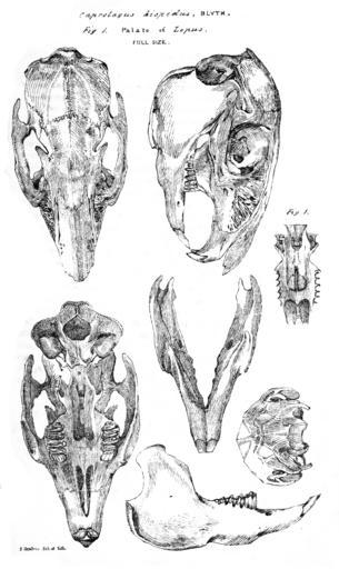 Keywords: CaprolagusPalateJASB.jpg Palate and skull of Hispid hare Caprolagus hispidus http //archive org/stream/journalofasiatic141asia page/248/mode/2up Journal of the Asiatic Society 14 1845 1845 J Hendrie text Edward Blyth pd-old Caprolagus hispidus Leporidae skulls Leporidae bones |
