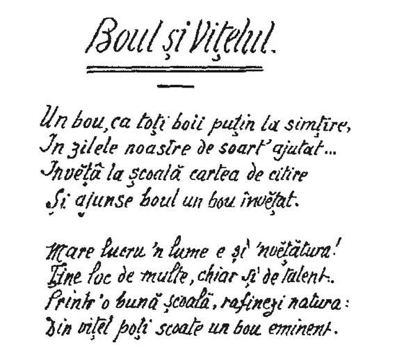Keywords: Caragiale - Boul şi viţelul.JPG en Boul şi viţelul The Ox and the Calf a satirical fable in Romanian The opening stanzas in Caragiale's own calligraphy Written in Berlin where Caragiale was residing at the time 1908 Titircă Sotirescu C-ia S Cioculescu bibliophile edition MLR Bucharest 2002 available through the Bucharest City Library http //digitool dc bmms ro 8881/R/3YEN91RDQHN2LLAT98CMIIVH6GP3F19S45D2I6YYIM6AN3KQEN-00734 func search DacoRomanica archive Creator Ion Luca Caragiale PD-old-100 Uploaded with UploadWizard Manuscripts of Ion Luca Caragiale 1908 texts Poems in Romanian Fables 1908 in Berlin 1908 in Romania |