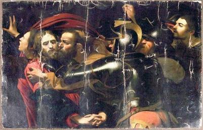 Keywords: Caravaggio - Taking of Christ - Odessa, damaged.jpg Artwork Die Festnahme Christi Creator Caravaggio or other date ca 1602 between 1602 1630 oil canvas cm 133 171 original size before cutting-out of the frame Institution Museum of Western European and Oriental Art Odessa Odessa Aufnahme des beschädigten Gemäldes nach der Sicherstellung durch die Polizei Das Gemälde wurde aus dem Rahmen geschnitten und zusammengefaltet wodurch die Farbe an den Faltstellen zerstört ist und sich Farbschichten vom Gemälde abgelöst haben können Die Festnahme Christi auch bekannt als žDer Judaskuss wurde am 30 Juli 2008 in Odessa gestohlen und im Juni 2010 in Berlin wieder aufgefunden Mehrere zeitgenössische Kopien des Werkes sind bekannt erstellt von Caravaggio oder seinen Schülern z B in der Irischen Nationalgallerie in Dublin File Caravaggio - Taking of Christ - Dublin jpg welches als Original in Betracht gezogen wird<ref>http //www tagesspiegel de/weltspiegel/beschlagnahmter-caravaggio-wohl-nicht-das-original/1871408 html Beschlagnahmter Caravaggio wohl nicht das Original Tagesspiegel 29 Juni 2010</ref> die Autorenschaft aller bekannter Kopien ist ungewiss Photo DPA Retrieved from Der Tagesspiegel http //www tagesspiegel de/weltspiegel/beschlagnahmter-caravaggio-wohl-nicht-das-original/1871408 html Beschlagnahmter Caravaggio wohl nicht das Original Other versions <gallery> File Caravaggio - Taking of Christ - Odessa jpg </gallery> The Taking of Christ by Caravaggio reflist PD-old-100 The Taking of Christ by Caravaggio Damaged paintings 2010 events Paintings in Odessa Museum of Western and Eastern Art |